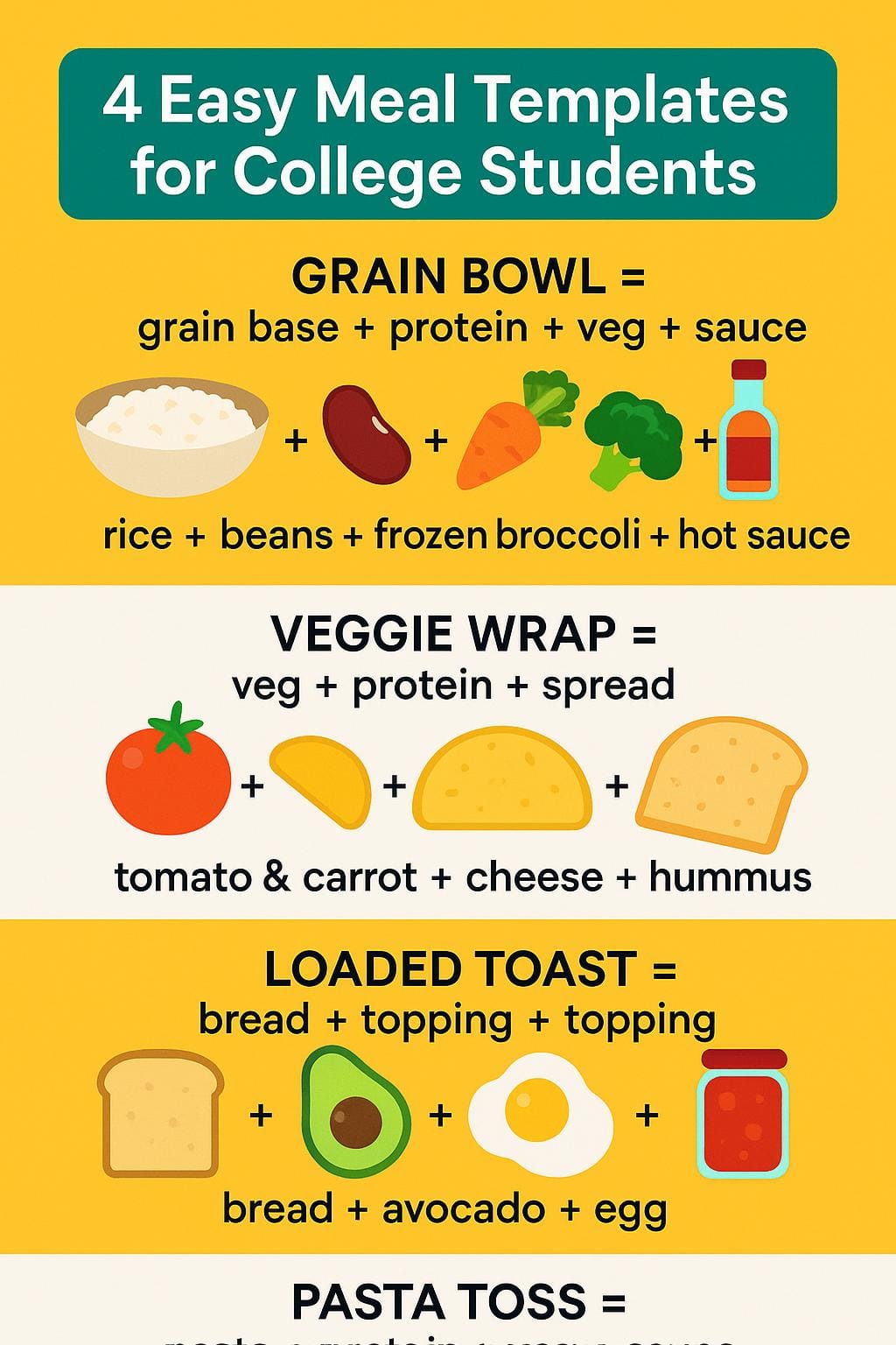 - Learning a few meal formulas like grain bowls and elevated scrambled eggs will serve you throughout college